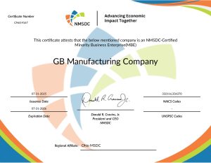 GB Manufacturing is owned by Mr. Nelson Reyes and is a certified Minority Owned Enterprise (MBE).